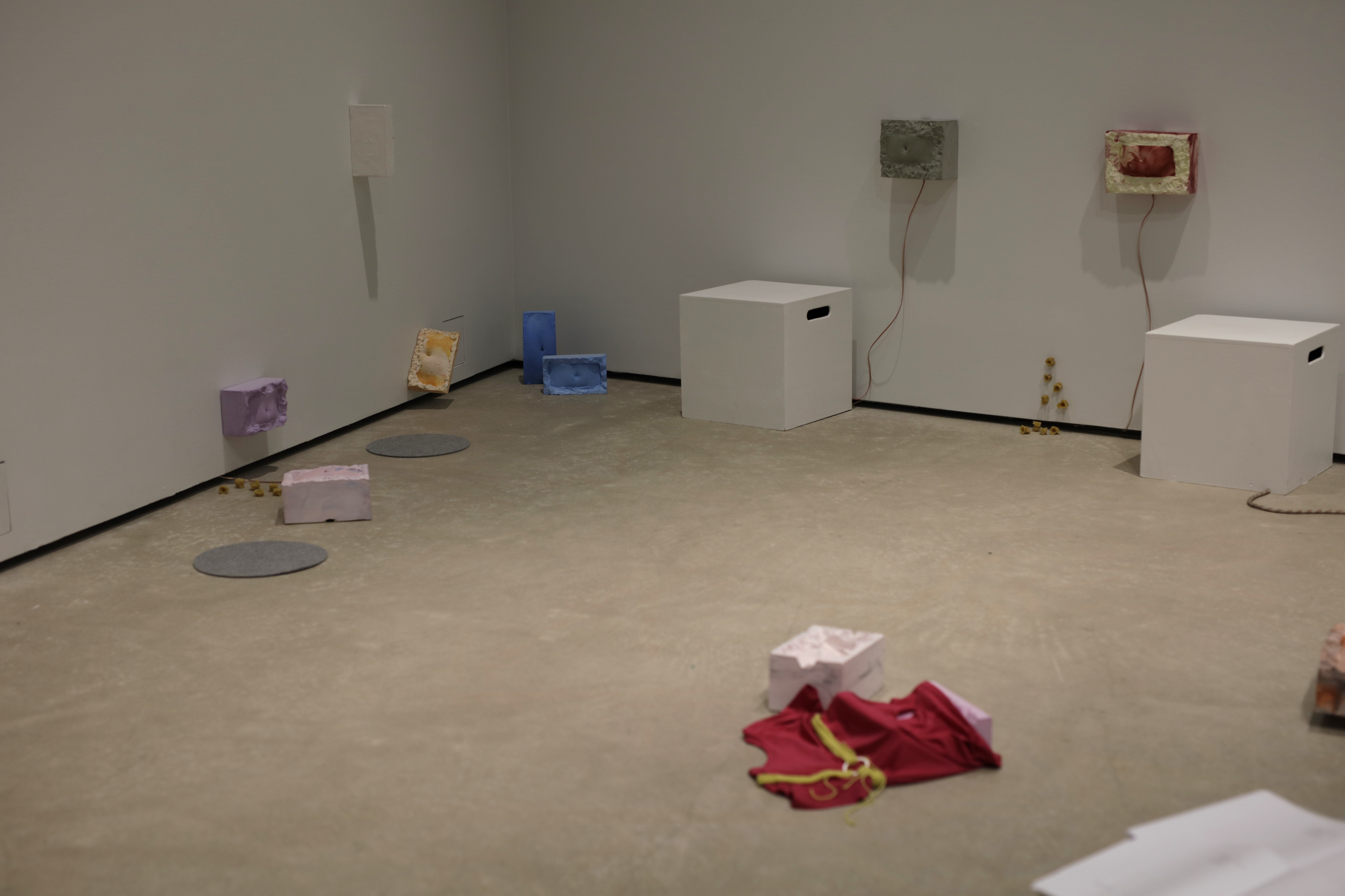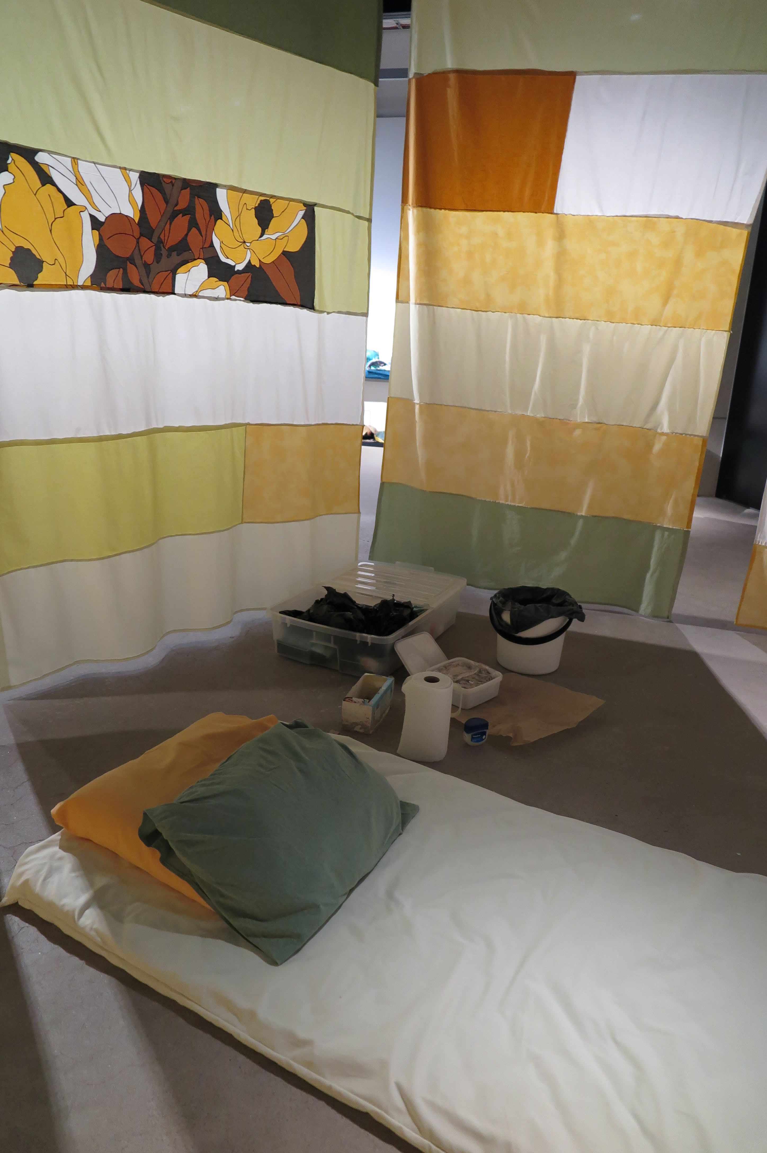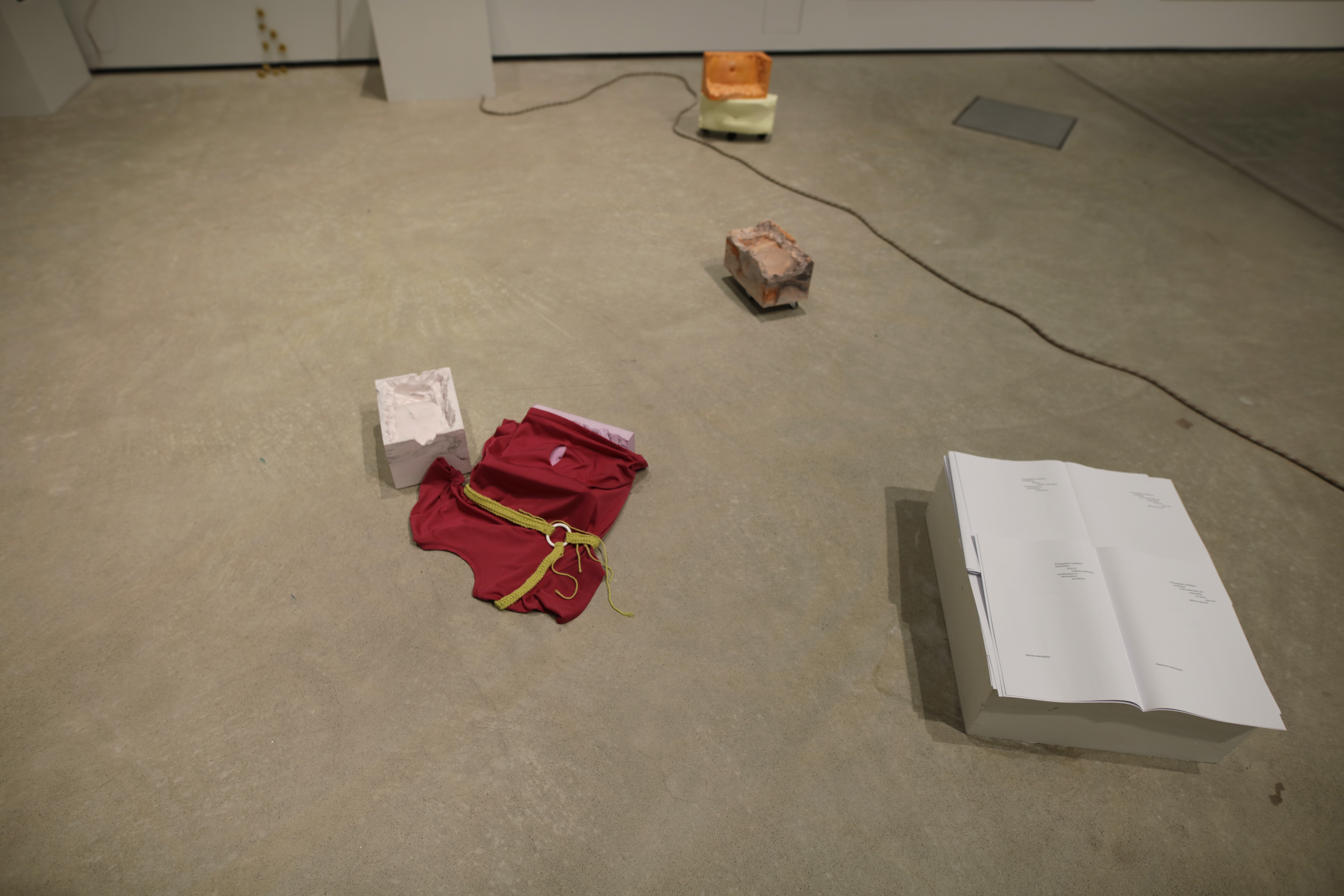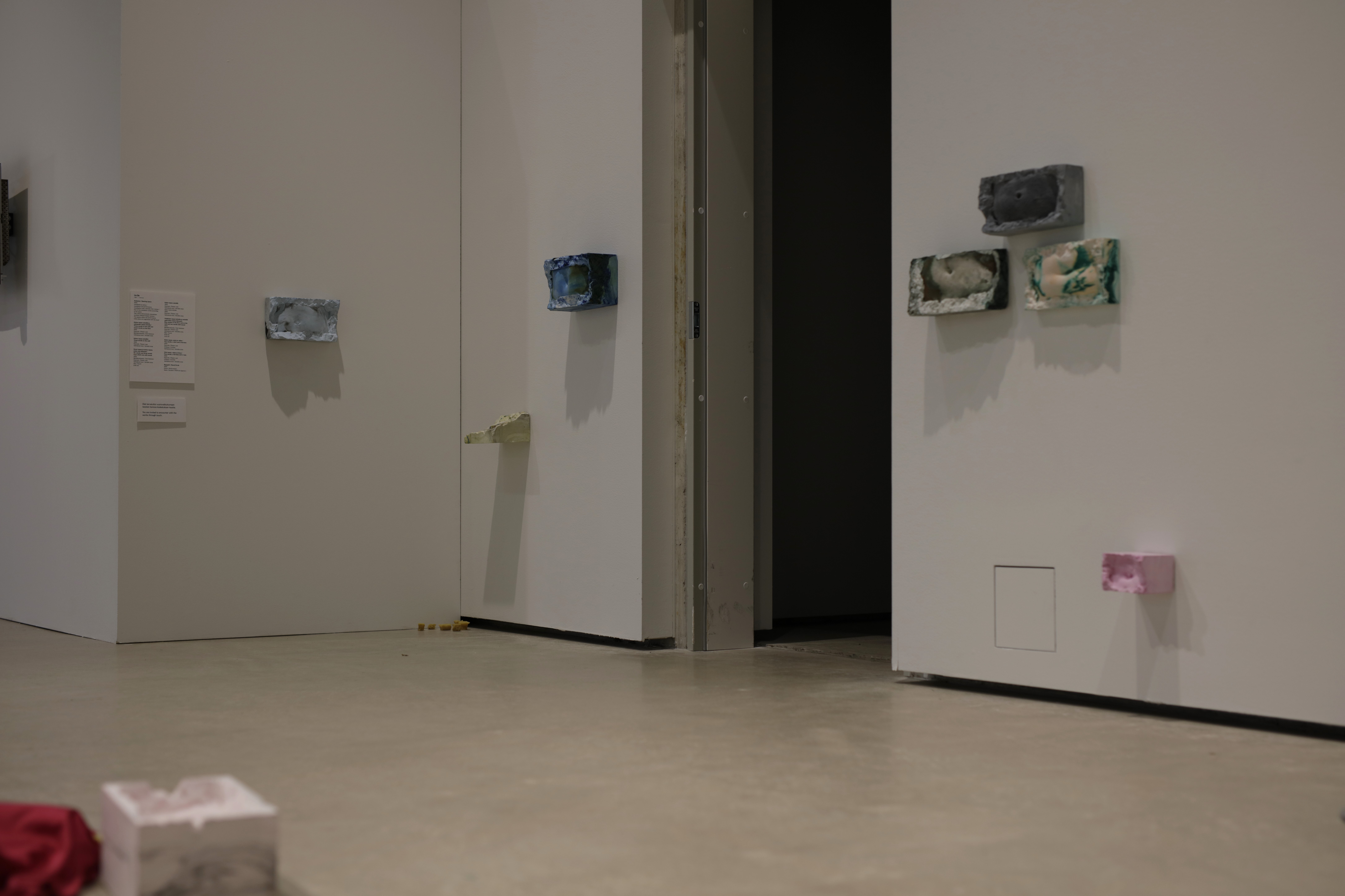 The installation was accompanied by a performance Napapiiri – Navel Circle which was an expedition led by five people from the group inside the Academy of Fine Arts. The work had ritual elements and it invited the audience to co-compose their own journey with the themes of care, touch and connectedness while traveling together alongside the other art works of the exhibition. The performance was rich in its details bringing together carefully considered elements (among other things edible navel sculptures) from different disciplines that enforce and support Lin’s corporeal thinking and aims as an artist.