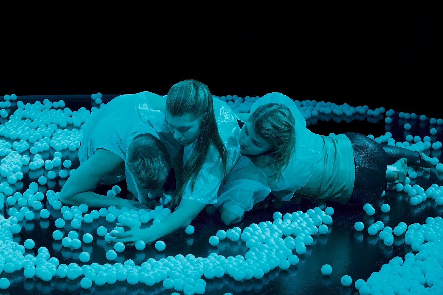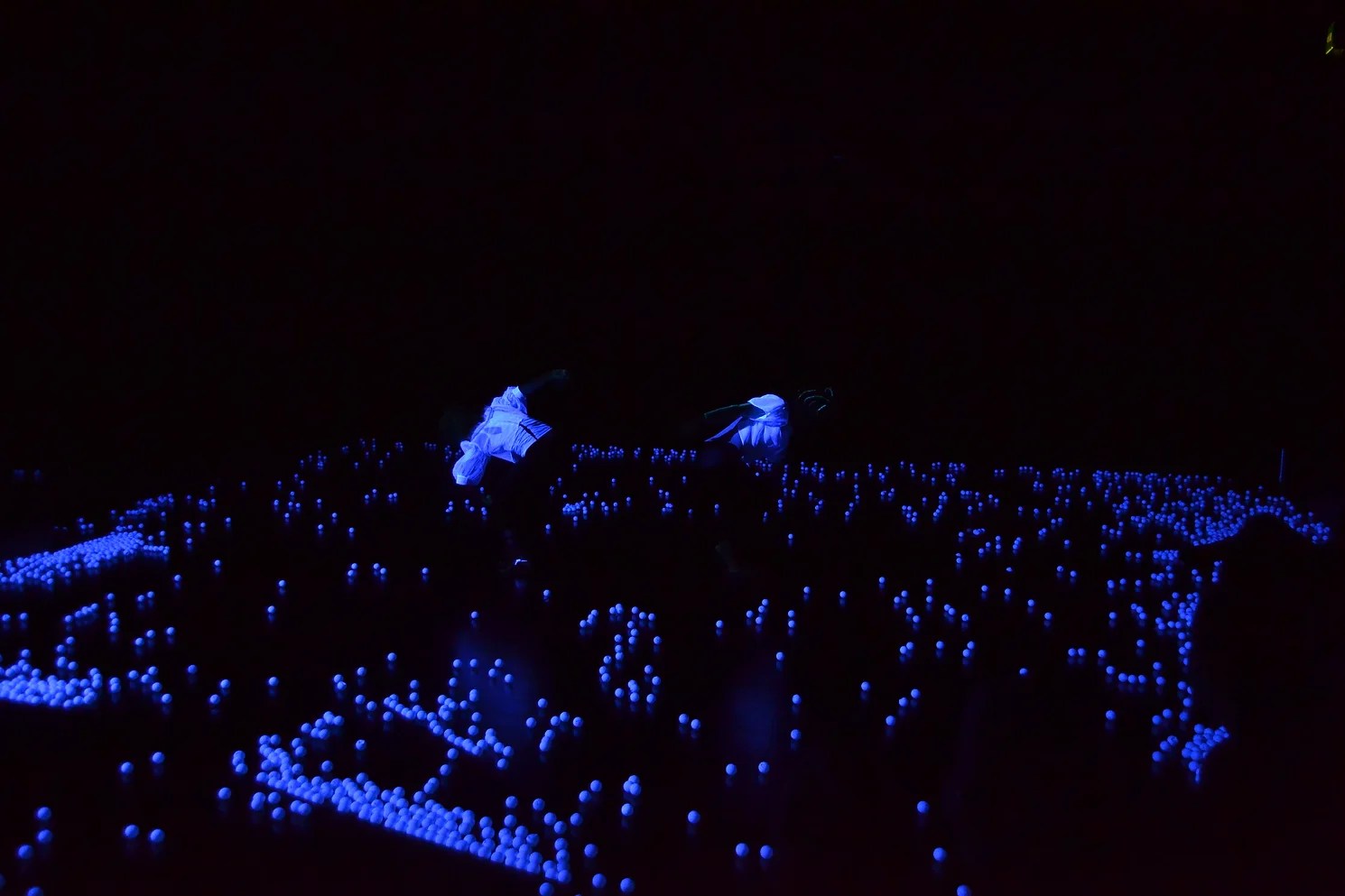 The thematic content of Continuum arises from research into gravity and magnetism. Another big element of the performance is the 4,000 ping pong balls that lie on the floor for the entire duration of the piece, retracting and expanding, heightening the viewer’s sense of depth of field. These elements allow us to explore the organisation of space and time through the study of how things are drawn together, attracted and repelled.