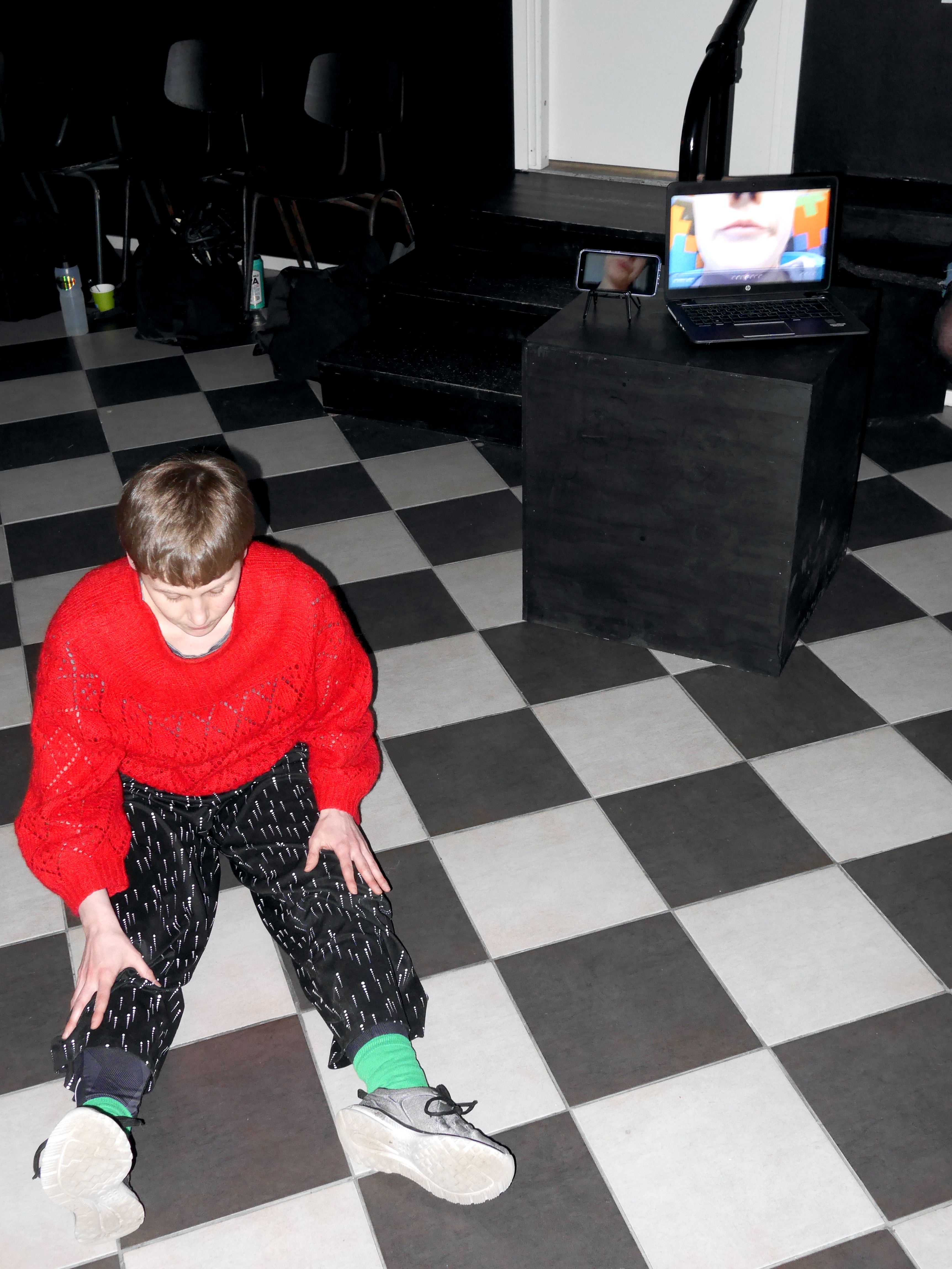 Dripping sketch is a solo for one mouth. It is a movement sketch and a vocal experience of the mouth. What kind of things move from the mouth and move the mouth? What goes in and out of the mouth? The performance is inspired by the materiality of the mouth and its expressive power. The performer bathes, wades and rumbles in the fluctuations of mouth moisture. They place their mouth as the object of collective perception and wonder. Dripping sketch invites the audience to connect with orality.